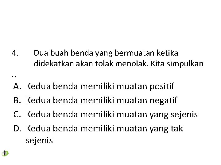 akan terjadi reaksi tarik menarik antara kedua benda itu. Muatan positif dari plastic pindah ke kain wol. Akibatnya, penggaris plastik disebut sebagai benda yang bermuatan listrik negatif. Jawaban yang benar adalah c. Peristiwa dan alasan yang tepat adalah. Tools and materials balon/sisir plastik potongan kertas material penggosok {kain wool, kain sutra, rambut} step experiments gosokkan balon/sisir dengan salah satu material penggosok. Hasilnya, kaca yang digosokkan pada kain sutra akan bermuatan listrik positif, sedangkan kain sutranya sendiri bermuatan listrik negatif. Kaca yang digosokkan kain sutera akan bermuatan positif. Elektron berpindah dari kain sutera ke kaca. Tetapi, jika batang kaca yang bermuatan didekatkan pada penggaris plastik yang bermuatan, akan didapatkan bahwa keduanya akan saling menarik, gambar 9c. plastik atau benda apapun menjadi bermuatan negatif karena berkelebihan elektron. penggaris plastik yang sudah digosok dengan kain wol akan menjadi bermuatan negatif, karena mendapatkan tambahan elektron dari wol. pada gambar di atas terdapat empat buah benda yang bermuatan.
